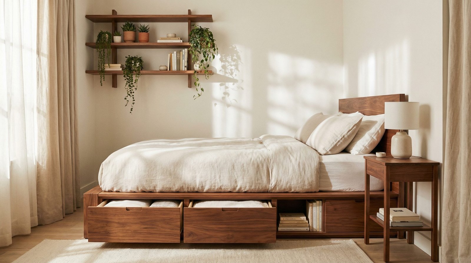 Most models include two to four deep drawers along the sides. That’s plenty of room for off-season clothing, extra blankets, or shoes. Everything stays hidden inside the frame, so the room still looks clean and uncluttered.